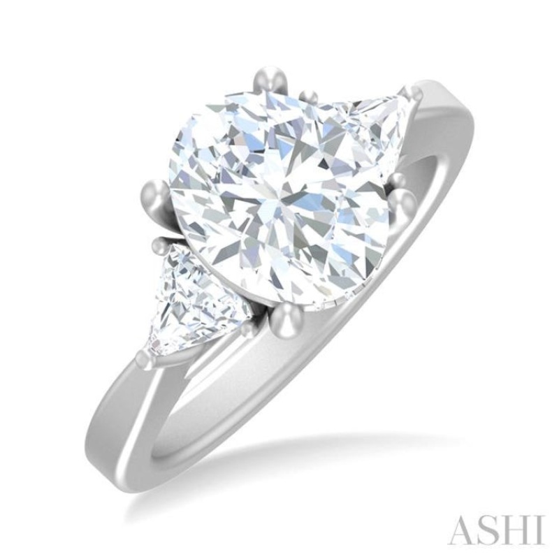 The enchantment of your love journey is rightly celebrated with this gorgeous semi-mount diamond engagement ring. Meticulously designed, the ring features a captivating tri-mount centerpiece, with a raised oval-shaped white gold center mount, gracefully placed on a plain gold shank. The ring being semi-mount, allows you to choose the center stone as per your taste and budget. It is designed to hold an oval cut center stone ranging from 2.75 ctw to 3.50 ctw. Enhancing the lower triangular mounts is a 1/4 ctw fancy set trillion cut diamond each, total 2 on either side of the center mount. 4 each, total 8, split prong set round cut diamonds embellish the front and back of the gallery. The ring is crafted in a rhodium finish 14 karat white gold. The total diamond weight is 1/2 ctw.