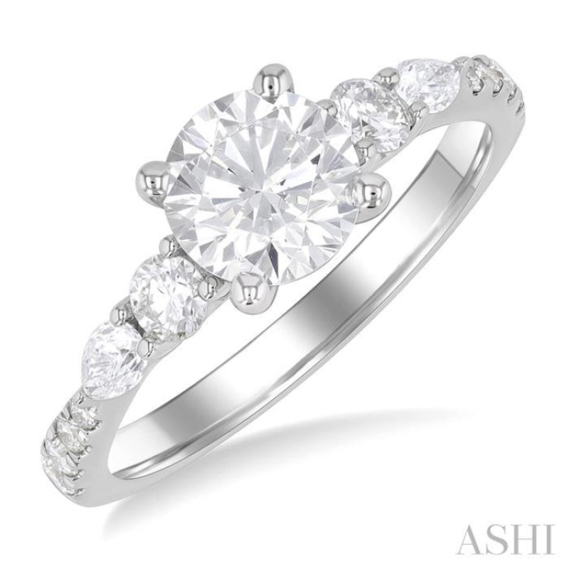 If you are seeking a ring that is pretty as well as pocket-friendly, then a semi-mount engagement ring is what you need. This diamond ring is a great option, as it offers an elegant look and lets you choose a center stone as per your budget. It features a 14 karat white gold prong-raised center mount, where a 0.85 ctw to 1.20 ctw round cut diamond center stone of your choice goes. Flanking the center mount are pre-decorated, prong set pear cut diamonds each, total 2, followed by a prong set round cut diamond each, total 2 on either side. Also adorning the shank are 4 each, total 8, prong set round cut diamonds on either side. A prong set round cut diamond each, total 2, accents the gallery center front and back. The semi-mount diamond engagement ring is crafted in 14 karat white gold. Total diamond weight is 1/2 ctw.