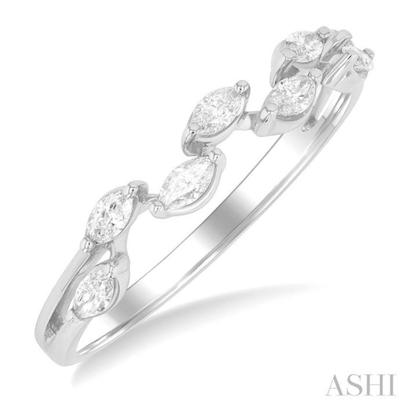 This scatter diamond fashion band, from the Scatter Diamond Collection, makes a delightful statement of individuality and style. It showcases a creative scattered zig-zag layout of 8 prong set marquise cut diamonds, giving it a playful yet refined look. The distinctive scatter design offers a fresh take on traditional band styles, making it perfect for those who appreciate unique and artistic jewelry. The marquise cut diamonds, known for their elongated brilliance, lend a touch of sophistication to the piece, while the zig-zag arrangement adds a sense of movement and flair. Carved in a polished rhodium finish 14 karat white gold, this diamond fashion band is a versatile accessory that can complement both formal and casual attire. Total diamond weight is 1/3 ctw.