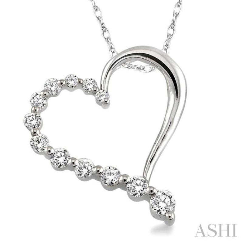 Celebrate a lifetime's journey of love together by bestowing her with this charismatic diamond heart half-journey pendant. This 14 karat icy fiery white gold open design heart pendant showcases magnificent 12 round cut diamonds graduate from smaller to lar