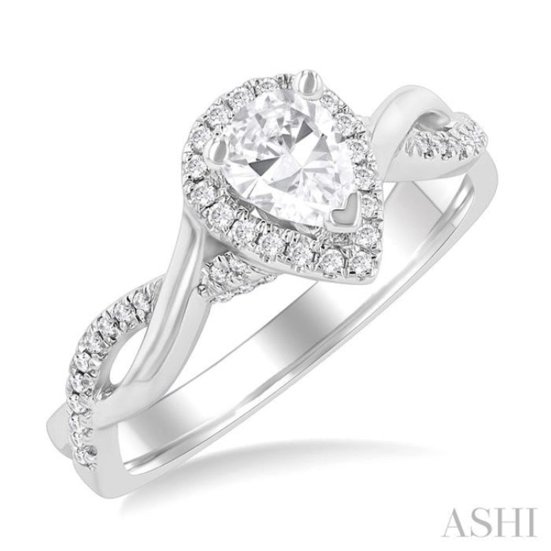 A symbol of your love, this semi-mount diamond engagement ring is a perfect blend of elegance and personalization. It offers a timeless design while allowing you to add your own special touch with the center stone. The engagement ring showcases a pear-shaped center mount, ready to hold a pear cut center stone of .30 ctw to .40 ctw of your choice. Surrounding the center stone is a shimmering halo of 19 pre-set micro wall set round cut diamonds, enhancing the shape with added brilliance. The gracefully twisted shank features an artistic interplay of a sleek plain gold arm and a diamond-adorned arm, creating a captivating contrast. A total of 42 micro wall set round cut diamonds embellish the twisted shank. The semi-mount engagement ring is styled in a polished rhodium finish 14 karat white gold. Total diamond weight is 1/5 ctw.