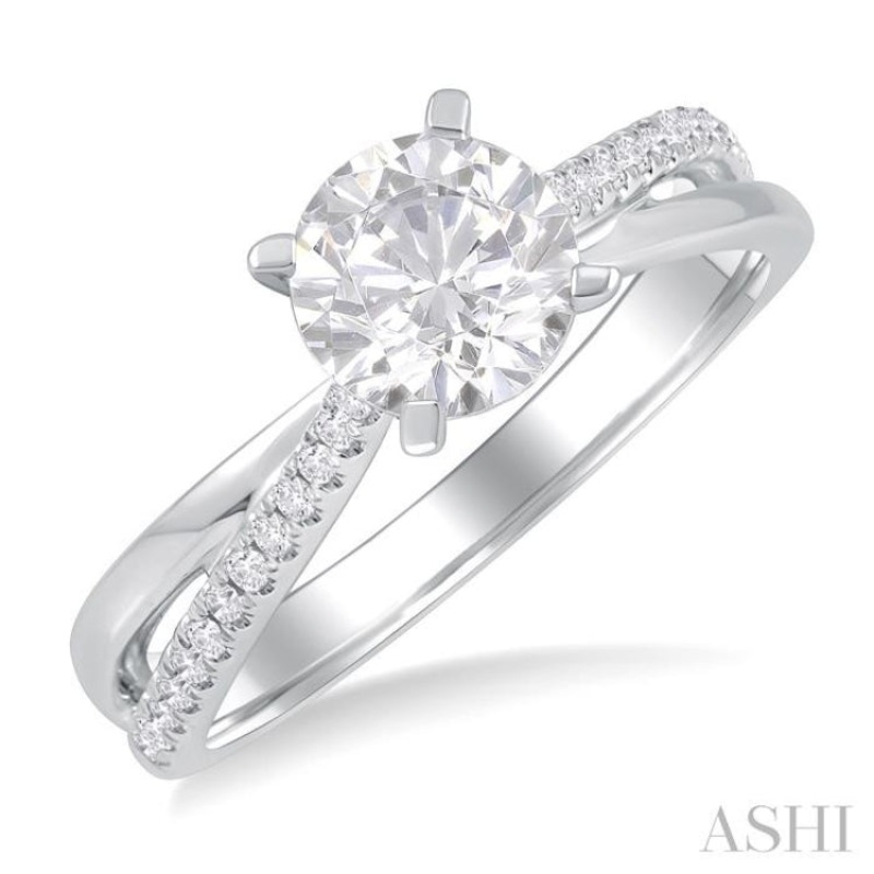 A simple but stylish semi-mount diamond engagement ring, this makes for a quick choice. Despite its simplicity, the ring has a refined look that impresses at first glance. As a semi-mount ring, it comes partly decorated, allowing you to choose the center stone as per your liking and budget. The ring features a prong-raised circular center mount, where a 0.85ctw to 1.20ctw round cut diamond of your choice goes. A split Criss-Cross shank, with a plain gold arm and a diamond adorned arm, completes the ring. There are 13 each, micro wall set round cut diamonds, total 26 on both sides of the shank together. Also, a bezel set round cut diamond each, total 2, is seen encrusted on the front and back of the head. The semi-mount diamond engagement ring is styled in a polished rhodium finish 14 karat white gold. Total diamond weight is 1/6 ctw.