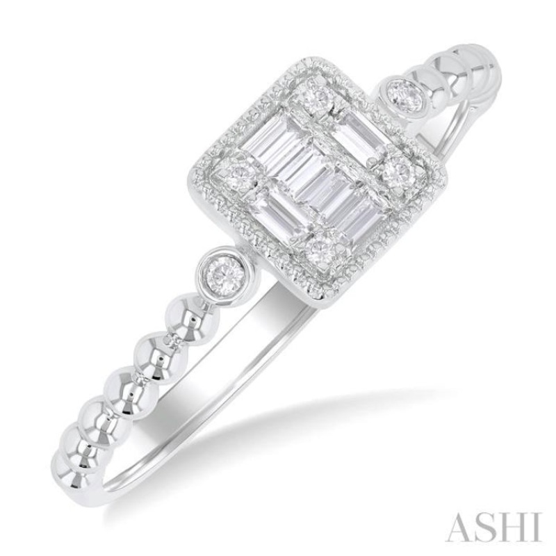 1/8 ctw Petite Bead Shank Square Shape Center Round Cut Diamond Fashion Ring in 10K White Gold