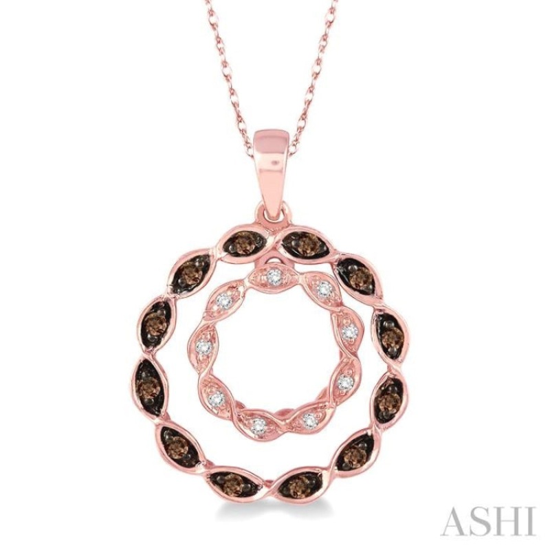 Make your statement of style with this ravishing diamond circle pendant. A circle of 9 prong set icy cool white round cut diamonds float inside a circle of perfect 12 prong set champagne brown round cut diamonds against a backdrop of glamorous 14 karat ros