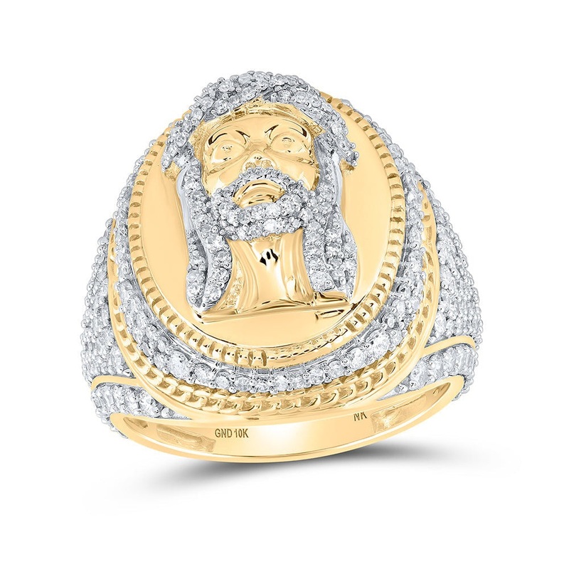 10kt Yellow Gold Mens Round Diamond Jesus Face Oval Ring 2-1/5 Cttw