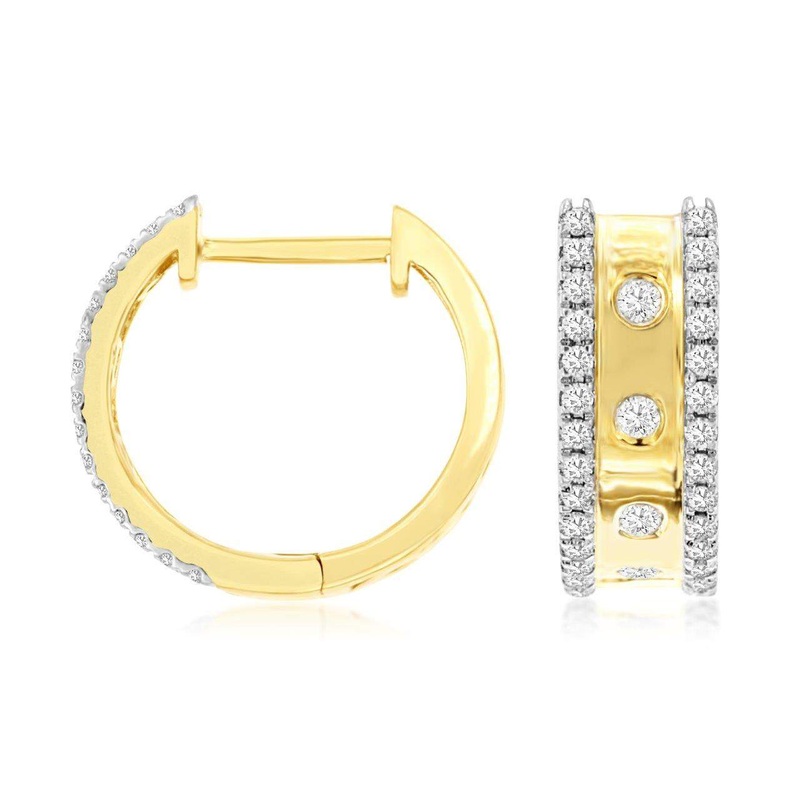 14K Yellow Gold Wide Huggie Hoops with Round Diamond Border and Gypsy Set Round Diamonds in Center, 68 Diamond= ~0.33 carat total of diamonds