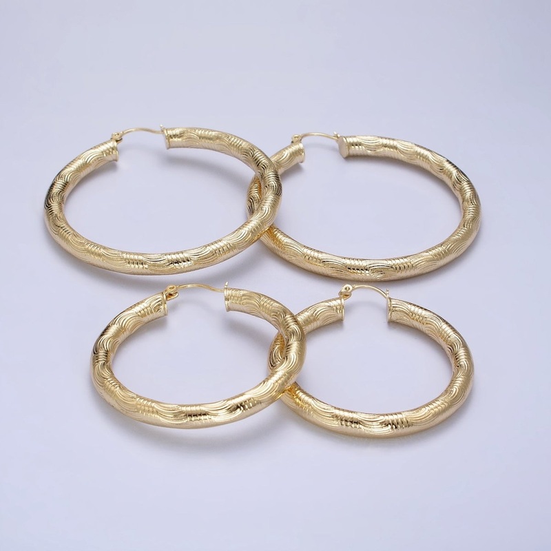 14K Gold Filled 35mm, 45mm, 55mm Curved Line Textured Latch French Lock Hoop Earrings | AE006 -AE008 35mm