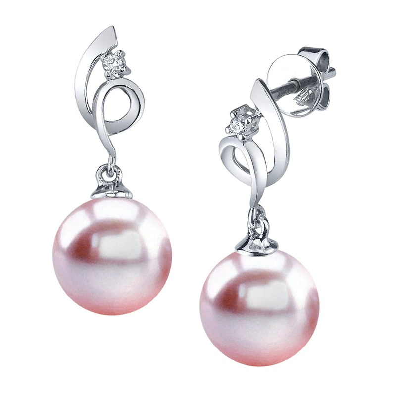 These beautiful earrings would make a beautiful match with our matching symphony pendant. These gorgeous 14K gold pearl earrings have beautiful 9mm AAAA quality pink freshwater pearls with a 'Very High' grade luster! Two beautiful diamonds adorn these roma