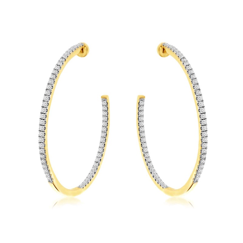 14K Yellow Gold Ultra Thin Round Diamond Inside and Outside Post Hoop Earring, 100 Diamond= ~0.30 carat total of diamonds