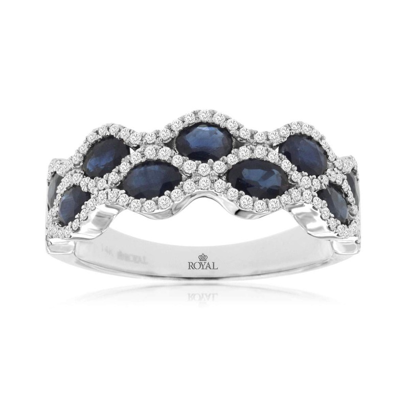 14K White Gold Double Row Round Diamond Scalloped Border with Two Rows of Blue Sapphires, Diamond=~.26 carats total weight Sapphires=~1.85 carats total weight