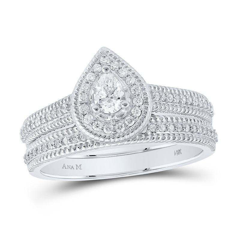 14kt White Gold Pear Diamond Halo Bridal Wedding Ring Band Set 1/2 Cttw