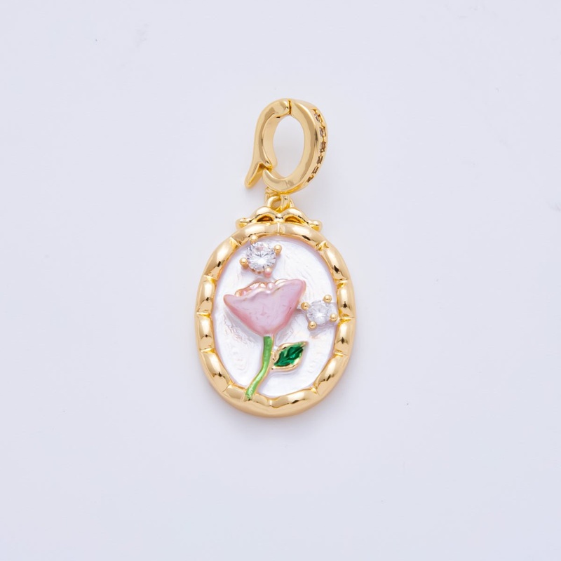 18K Gold Filled 33mm Clear CZ Enamel Art Shell Pearl Pink Tulip Flower Pendant | AH-818