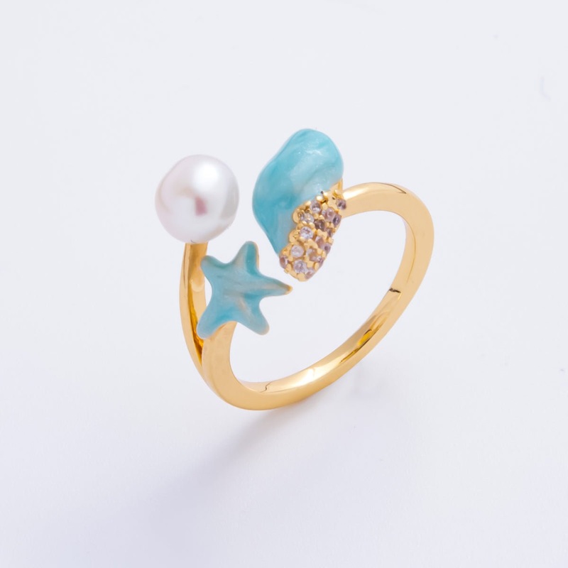 18K Gold Filled Sky Blue Enamel Nautical Theme with Starfish, Clam Shell, & Shell Pearl Adjustable Ring | O-035