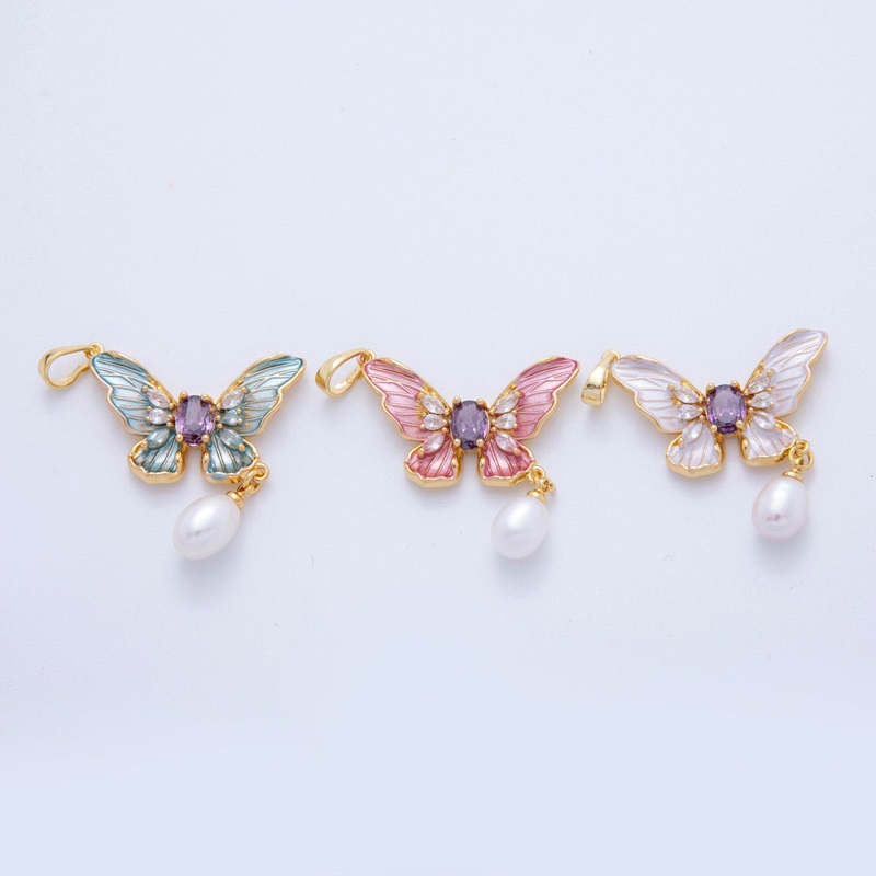 18K Gold Filled White, Blue, Pink Enamel Butterfly CZ Pearl Drop Pendant | AH759 – AH761 White