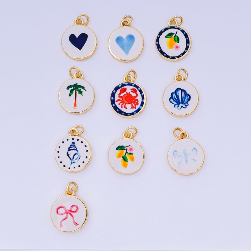 24K Gold Filled 18mm Enamel Art Beach Theme Charm in Palm Tree, Crab, Heart, Lemon, Crab, Sea Shell and Ribbon Bow | AJ-515 AJ-517 AJ-519 AJ-521 AJ-531 AJ-538 AJ-541 AJ-542 AJ-543 AJ-548 Blue Conch Shell