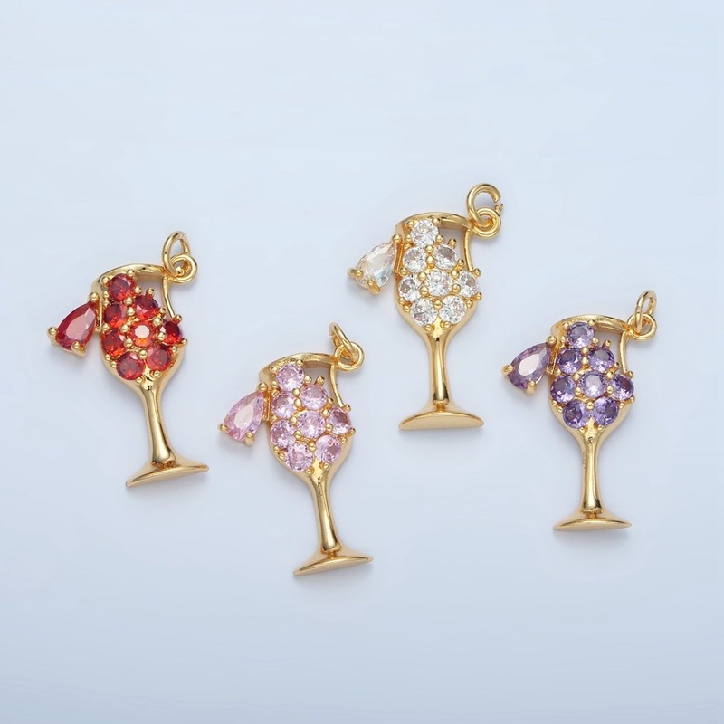 24K Gold Filled Clear, Red, Pink, Purple Micro Paved CZ Open Champagne Alcohol Drink Charm | E681 E682 Clear