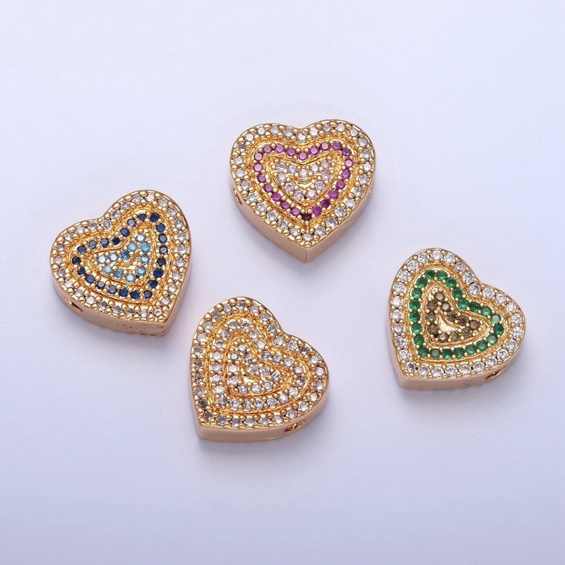 24K Gold Filled Micro Pave Cubic Zirconia Heart Spacer Bead, Multicolor Cubic Zirconia CZ Valentine Love Jewelry Making Component W-898 W-899 W-900 W-901 Green