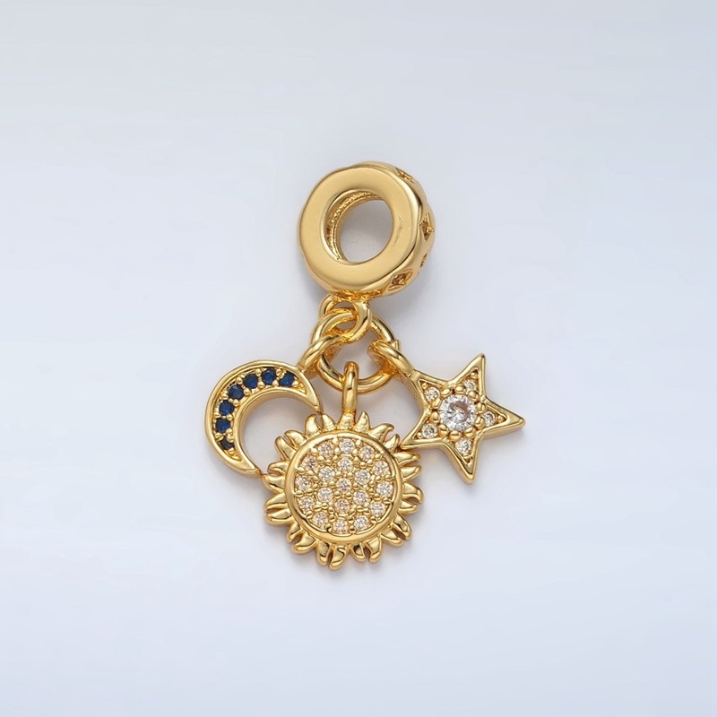 24K Gold Filled Triple Celestial Sun Star Crescent Moon Micro Paved CZ Rhondelle Bail Drop Pendant | AC082