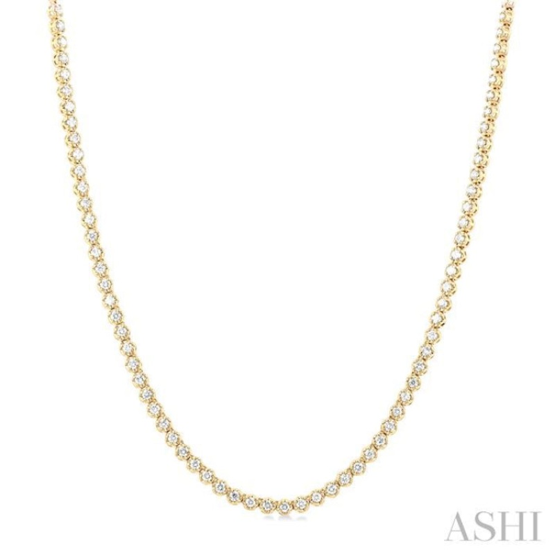 A fabulous illusion diamond eternity tennis necklace, this offers grandeur and appeal. It features a close-knit row of round cut diamonds that line the necklace end to end, which is why it is called an eternity necklace. There is a total of 137 prong set r