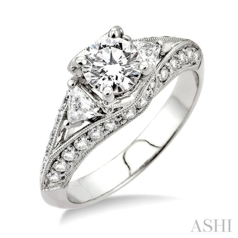 True love can be expressed in few words and symbolized with this Diamond Semi-Mount Ring ornamented with 2 exquisite paired trillion cut diamonds of 1/5 ctw and adorned with 32 twinkling round cut diamonds beautifully prong and pave set in luminous 14 kara