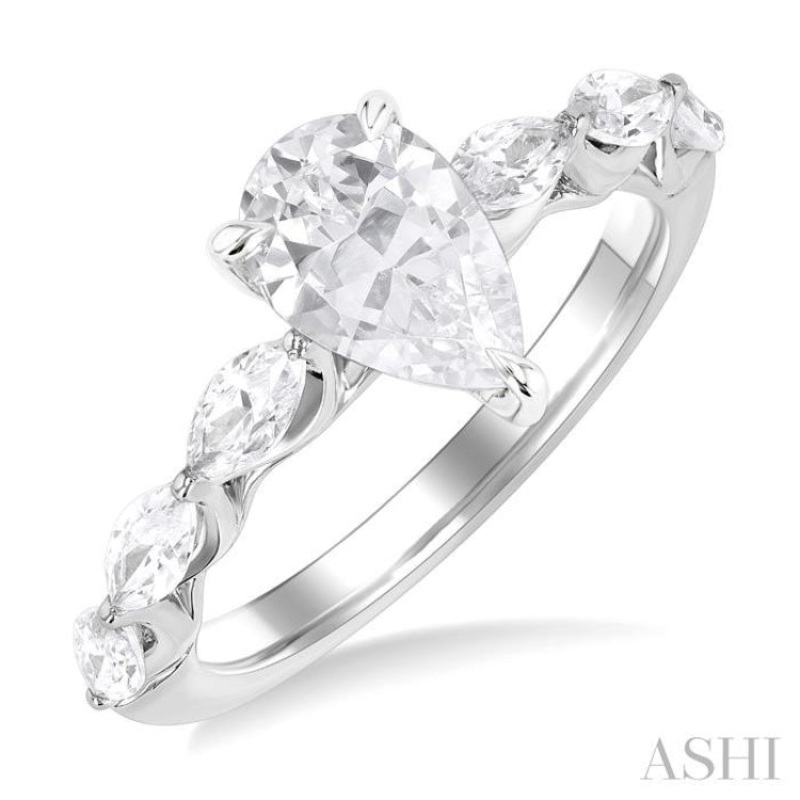 Begin a new chapter of your love with this exquisite semi-mount diamond engagement ring that offers a captivating blend of beauty and sophistication. It also gives you the freedom to choose a desired center stone, letting you the opportunity to create a ring that is as unique as your love, and ensuring that every glance at the hand serves as a reminder of the special bond you share. The ring features a 14 karat white gold prong-raised pear-shaped center mount, where a pear cut diamond ranging between 1.65 ctw to 2.35 ctw of your choice gets installed. Beautifying the shank are pre-decorated, 3 each fancy prong set marquise cut diamonds on either side, total 6 diamonds. 16 microscopic split prong set round cut diamonds embellish the gallery region. The semi-mount engagement ring is crafted in a rhodium finish 14 karat white gold. The total diamond weight is 3/4 ctw.