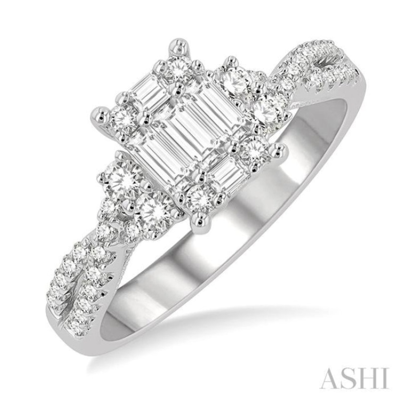 A gorgeously styled fusion diamond engagement ring, this offers visual beauty, making it an instant choice. It features a raised square center mount and a split Criss-Cross shank, both of which are adorned with diamonds. The square mount is embellished with 3 invisible set baguette diamonds, horizontally lining the center, with an invisible set baguette diamond each flanking the center baguette at the top and bottom. A prong set round cut diamond each, fills the 4 corners of the square mount. On a lower border, are 2 each prong set round cut diamonds on either side of the center mount. The split Criss-Cross shank is accented with a total of 28 pave set round cut diamonds, 14 each on either side. The ring is styled in a polished rhodium finish 14 karat white gold. Total diamond weight is 3/4 ctw.