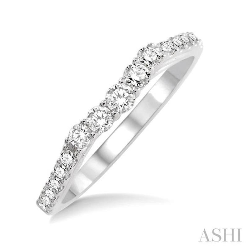 Beautifully crafted in glistening 14 karat white gold, this attractive diamond wedding band features 17 sparkling prong and pave set round cut diamonds. It will keep her always thinking of you. Total diamond weight is 3/8 ctw.