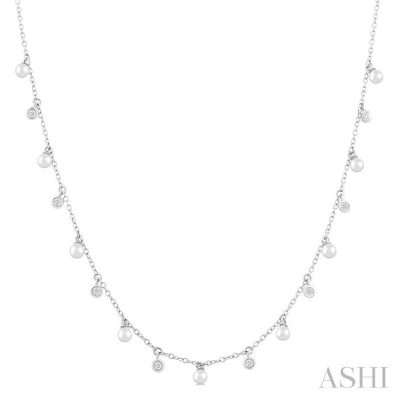 3 MM Round Shape Cultured Pearl and 1/6 ctw Round Cut Diamond Station Necklace in 14K White Gold