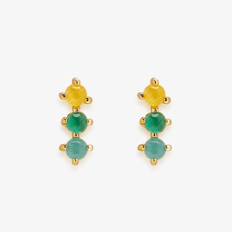 A beautiful, centerpiece-worthy cascade of emerald, citrine, and kyanite gemstones inspired by pacific autumn. Set in gold-plated brass casting.