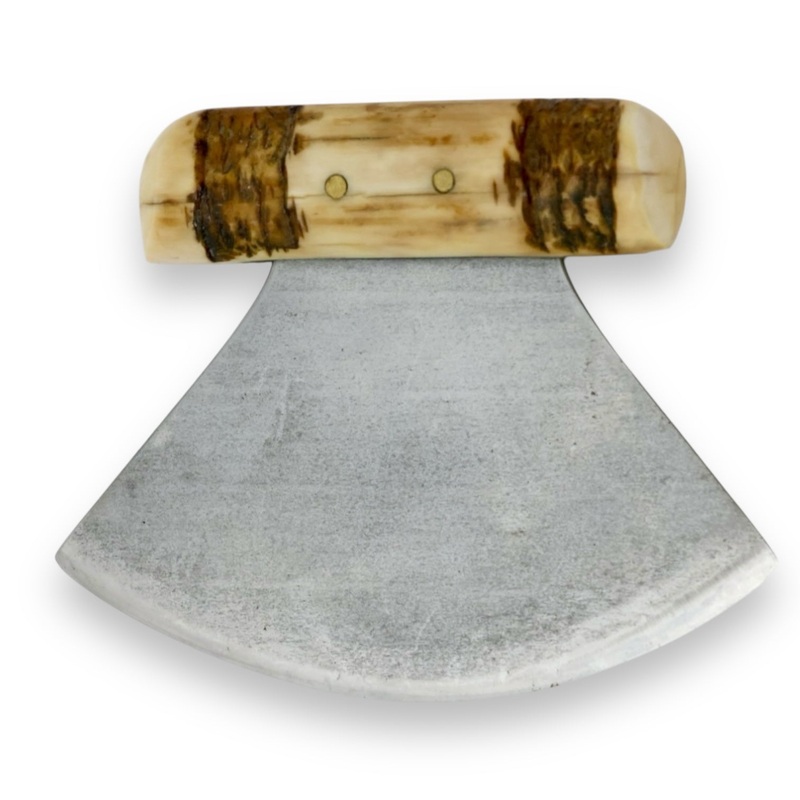 One of a Kind with fossil walrus ivory artifactBlade Width - 4 1/2 This Ulu Knife is handmade in Homer, Alaska by Maynard Linder.The Blade is made from carpenters' handsaw steel with a high carbon content. This type of steel is preferred for its lightness,
