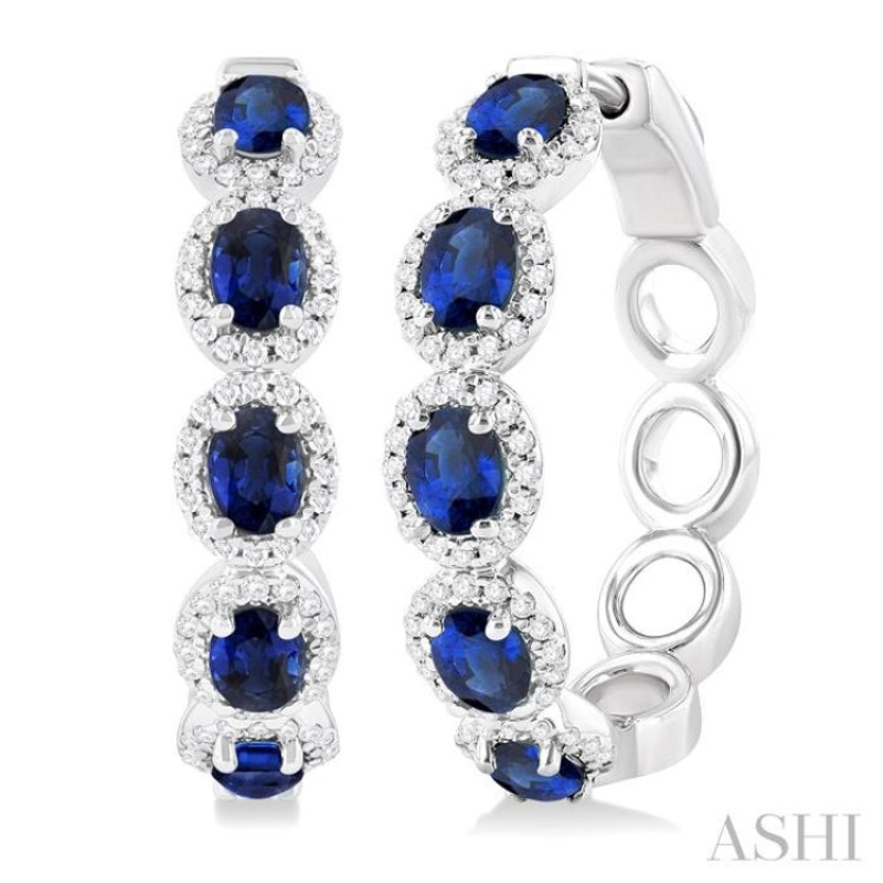 4X3 MM Oval Cut Sapphire and 1/2 ctw Round Cut Diamond Halo Precious Hoop Earring in 14K White Gold