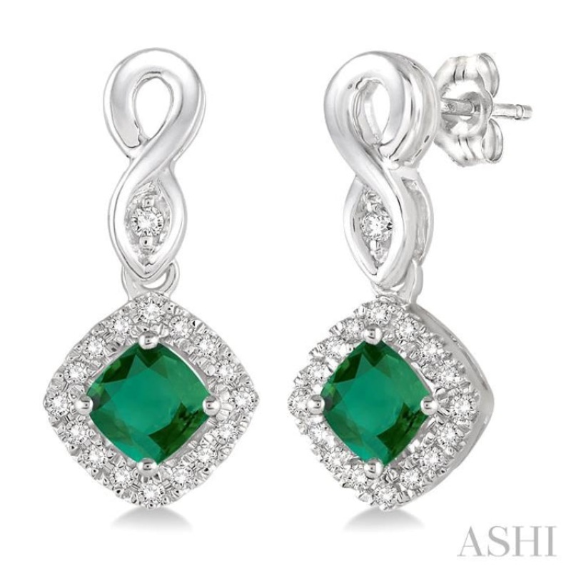 4×4 MM Cushion Cut Emerald and 1/5 Ctw Round Cut Diamond Earrings in 10K White Gold