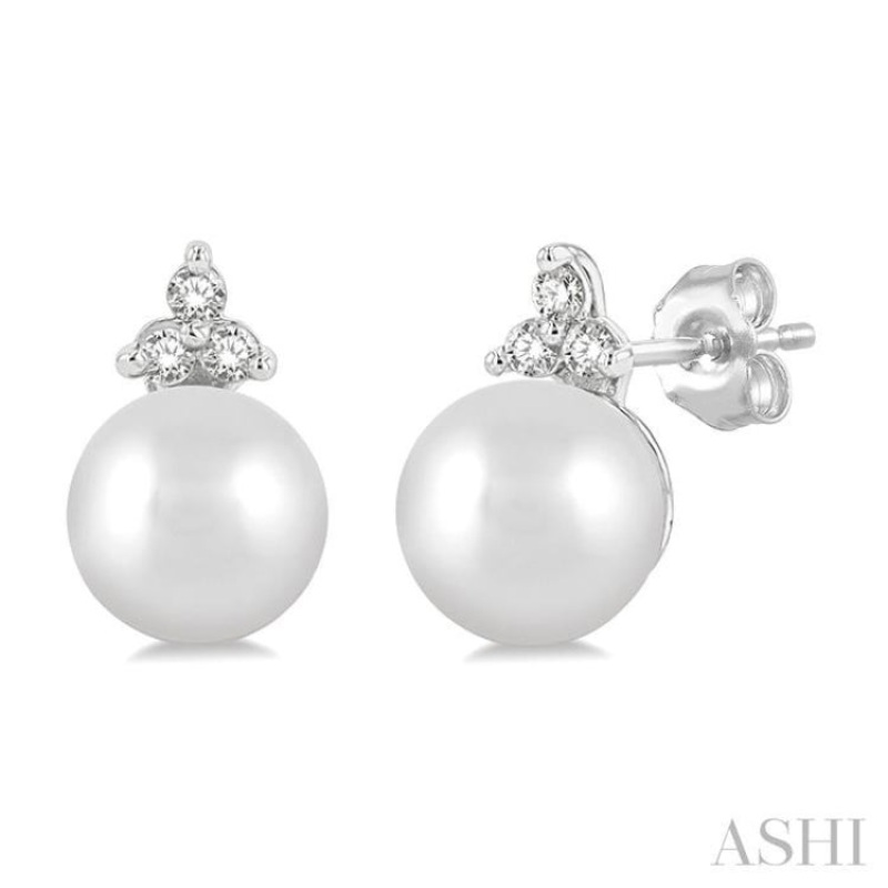 5.5 MM Round Cut Cultured Pearl and 1/20 ctw Petite Round Cut Diamond Fashion Stud Earring in 10K White Gold