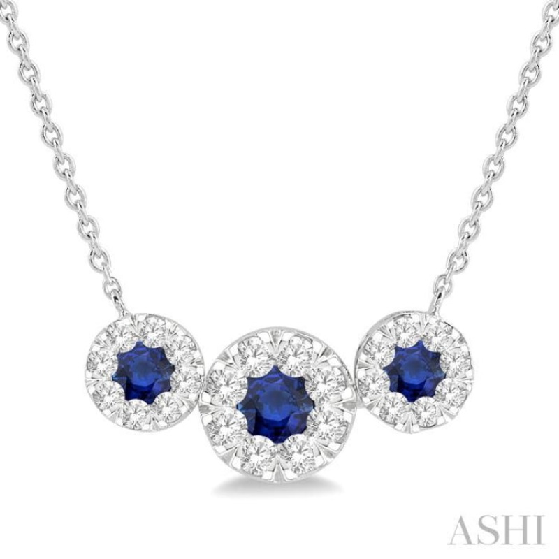 5/8 ctw Tri Stone 3.80MM & 3MM Sapphire and Round Cut Diamond Precious Necklace in 14K White Gold