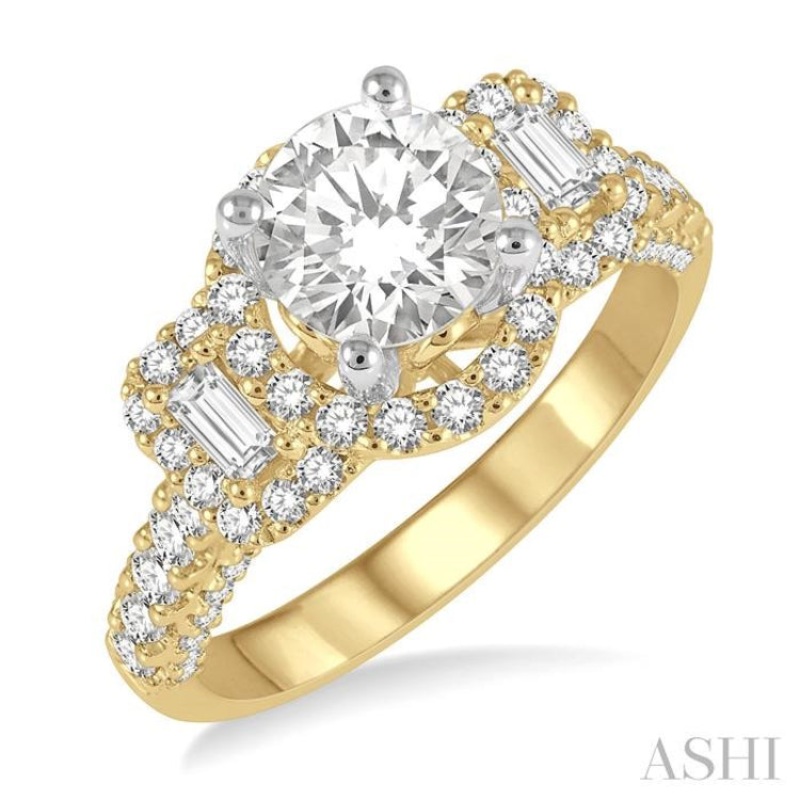 A stunning diamond semi-mount engagement ring, this presents an eye-catching design that appeals instantly. It features a tri-mount centerpiece, with a raised circular border center mount, and a rectangular mount each flanking it from a lower level, slightly raised above the shank. As this is a semi-mount ring, it lets you choose the center stone for it, which must be a round cut stone within 0.85 ctw to 1.20 ctw. This is installed on the prong raised middle of the center mount, while the border is embellished with 16 prong set round cut diamonds. On the rectangular mounts is displayed a fancy set baguette diamond each in the center, with 8 prong set round cut diamonds each surrounding it on either side of shank. 5 each prong set round cut diamonds, total 10, adorn the shank on either side. Moreover, an arch in the ring interior is accented with 25 each, total 50, prong set round cut diamonds at the front and back with milgrain finish. The ring is molded in 14 karat yellow and white gold. Total diamond weight is 7/8 ctw.