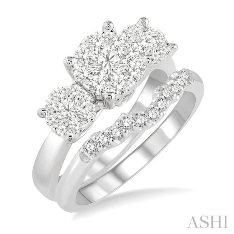 The Lovebright collection can be described with the synonyms of beauty, glamor, creativity. It offers a 3/4 ctw engagement ring and 1/6 ctw wedding band. The lattice engagement ring features 3 circular mounts, a raised mount in the center and a small circular mount each flanking it on either side, on a lower level. Each of these mounts is embellished with 9 invisible set round cut diamonds, one in the center and 8 surrounding. There is a total of 27 diamonds decorating the 3 mounts. A bezel set round cut diamond each, adorns the center front and back of the gallery. The wedding band features a triple wave center, with a slightly larger middle wave than the ones flanking it. The center wave is decorated by 3 pave set round cut diamonds while 4 each adorn the smaller waves. The wedding band is fashioned in 14 karat white gold. Total diamond weight is 7/8 ctw.