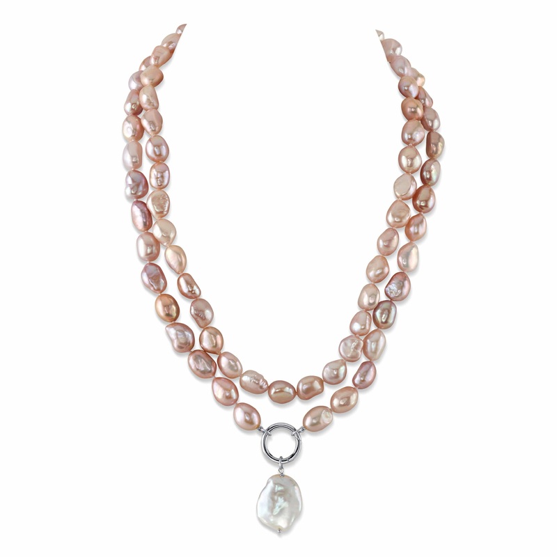 This 9.5-10.5mm oval pink freshwater double strand pearl necklace is certain to grab the attention of anyone who sees this beauty. This pearl necklace is compiled of two strands of hand picked oval pink freshwater pearls with high grade luster that has an