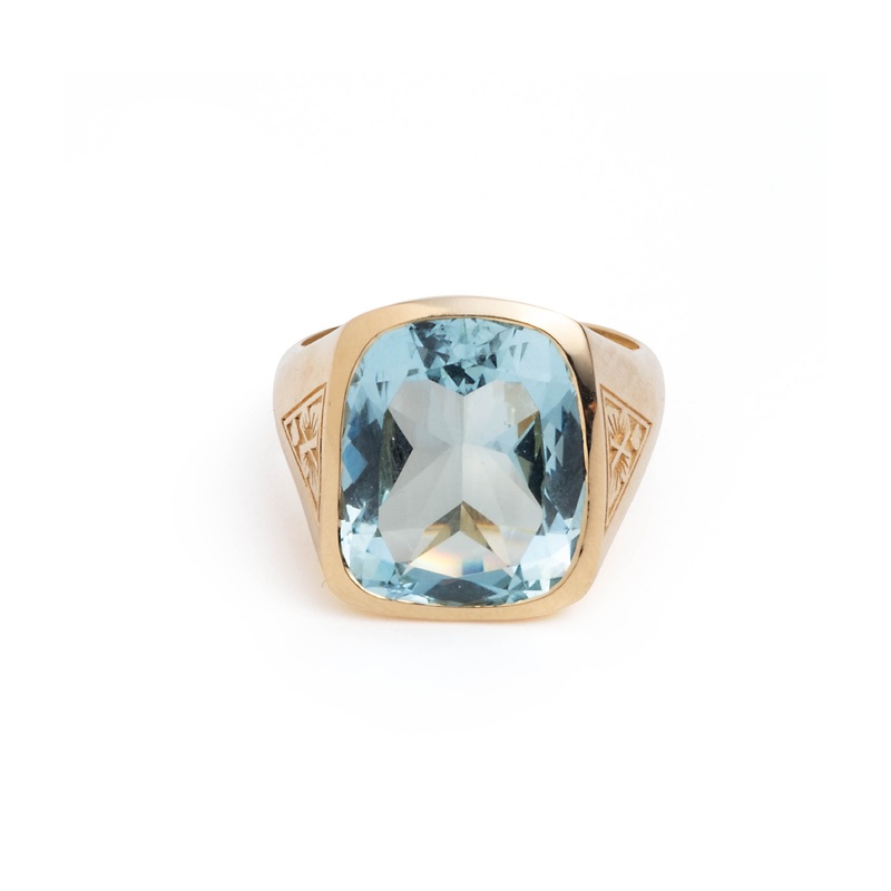 Handcrafted in 18k Yellow Gold, this One of a Kind 9.9 ct Aquamarine Gemstone Ring is the first of our Collector’s Series, V MMXXIV (May 2024). Etched deep into each shoulder of our Reverie Signet Ring is a triangle fitted with a butterfly and a tiny spade. The butterfly has been a symbol of the soul for thousands of years. When how we live reflects our soul, joy animates us and lets our soul soar freely – like a butterfly.
