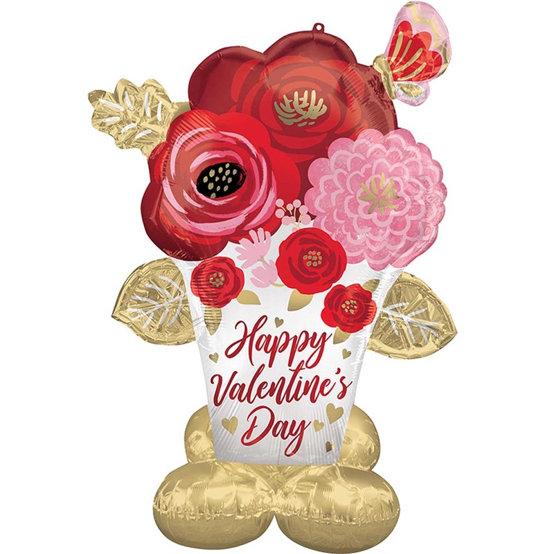 Item Includes:Balloon.Straw.Elastic strap.Features:Flower bouquet-shaped foil balloon.'Happy Valentine's Day' printed message.Self-sealing.Sizing:99cm x 1.3m / 39in x 53in.Material:100% Foil.Please note: Air fill only. Balloons do not come inflated.Blossom