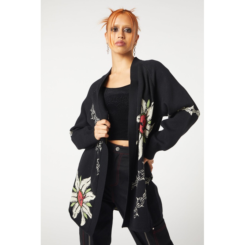 Oversize Cardi- Long, Raglan Sleeves- No Buttons- Relaxed Fit- Placement Artwork On Front And Back- Contrasting Rib Knit At Neckline And Hems- Made From Soft Knitted Cotton- Available In BlackProduct Code: DGFV315
