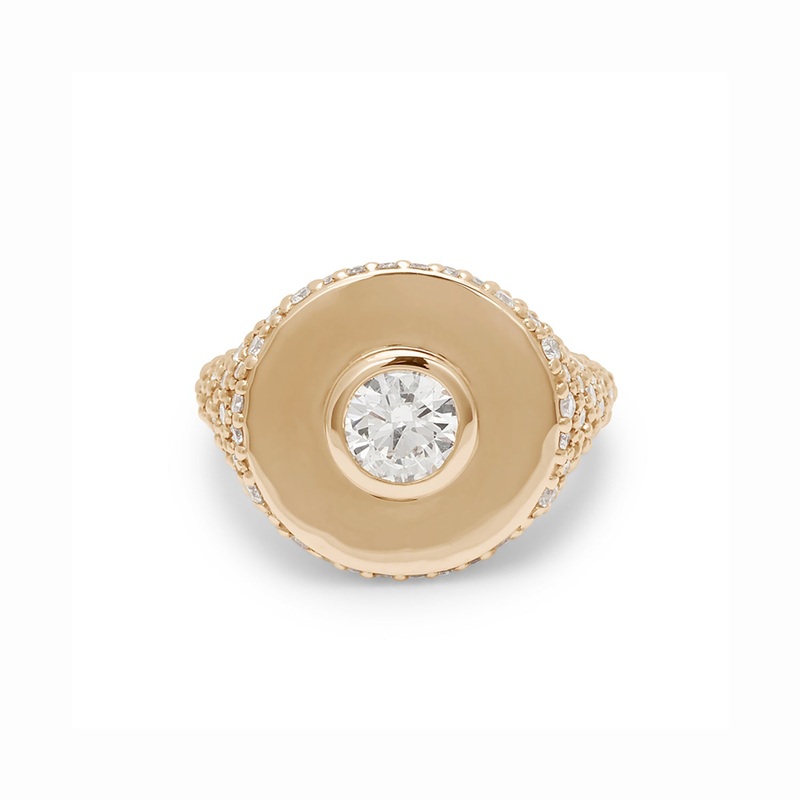 TheAll Seeing Signet is made from recycled14k yellow gold. A round lab white diamond is set in the centre of the face, with reclaimednatural white diamonds pav set in a tapered 3.5mm to 2.5mm band.The perfectly covetable All-Seeing Signet contains equal pa