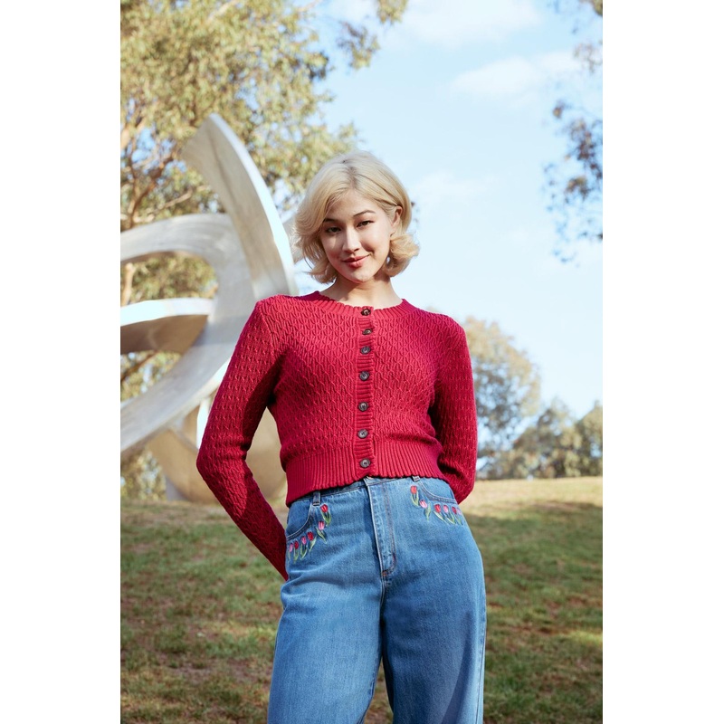 Danity textured knit cardigan, featuring a round neckline in the cosiest shades of red and green- fits close to the body- long sleeve- decorative knit design- round neckline, button through- acrylic cotton blend yarn- available in green & redProduct Code: