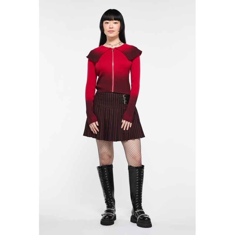 Ombre Coloured Cardigan With Wide Collar- Fitted Shape- Long Sleeves- Zip Closure At Front With Moon Shaped Trim Zip Puller- Very Wide Knitted Collar Detail At Neck- Black/Red Gradient Coloured Yarn- Made From Soft Knitted Viscose/Polyester/Nylon Yarn- Ava