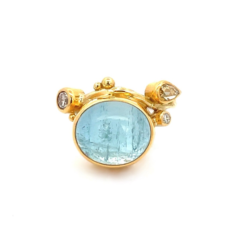 The Aquamarine Seafire Ring is hand made from recycled 18k yellow gold and 22k yellow gold, and features aquamarine and white diamonds.Part of Bergsoe's Seafire Ring Gold Collection - "I began creating the Seafire Jewellery around 1995. I had experienced s