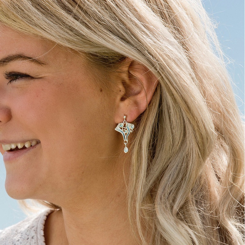 These Arctic Stream drop earrings in sterling silver feature an ice, rock and flowing water design, beautifully highlighted in Sheila's 'Arctic Blue' enamel. The earrings are approximately 18mm by 32mm overall with a small enamelled droplet hanging from th