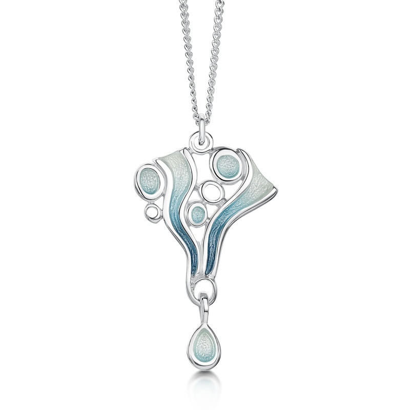 This small Arctic Stream pendant necklace in sterling silver features an ice, rock and flowing water design, beautifully highlighted in Sheila's 'Arctic Blue' enamel. The piece is approximately 18mm x 29mm overall and hangs elegantly on a sterling silver w