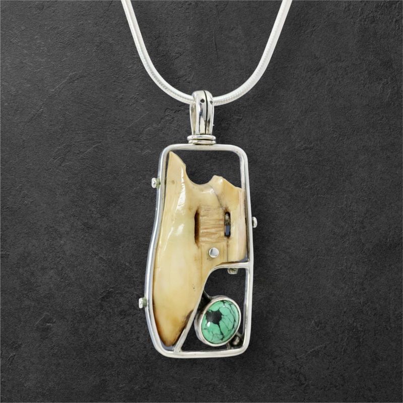 Fossil Walrus Ivory, Turquoise & .925 Sterling SilverLength of Pendant - 3 1/4"One of a kind...Chains are available! Click Here!