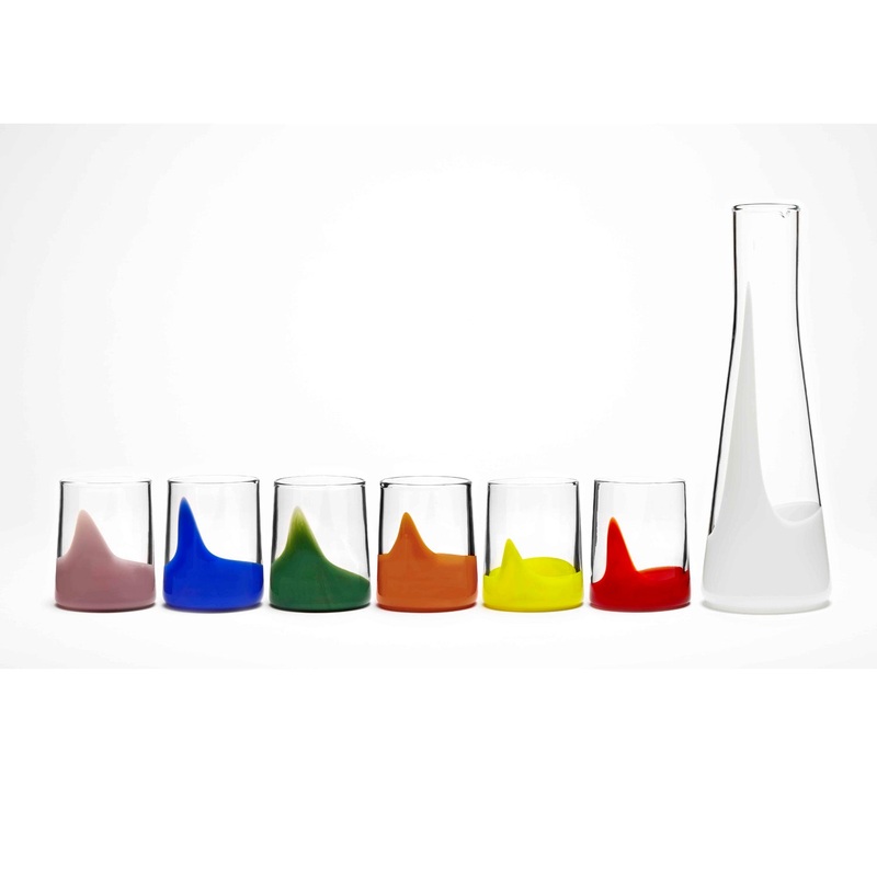 The stunning Ash Set – White consists of a hand blown Carafe in white with 6 matching drinking glasses in a vibrant mix of colours: rose, blue, green, yellow, orange and red . The design is achieved through the movement of colour blown into the glass, a technique that is extremely difficult to master and each piece is truly unique. Part of the MARTA Intimate Collection of hand blown contemporary glass sets by Bib & Sola.Inspired by the effortless composure of women water bearers throughout the world, a percentage of all proceeds from each sale goes directly to The One Foundation’s development of pump water systems in rural Malawi.