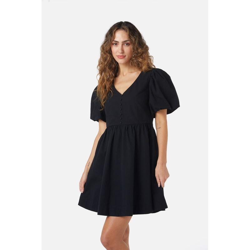 Black puff sleeve mini dress- wear this sweet little black dress anywhere this summer- featuring a soft v neckline with a faux button down front- puffed sleeve with elastic cuff- full gathered mini skirt- made of a textured organic cotton- available in bla