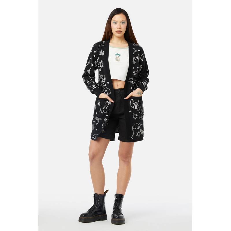 Intarsia Cardigan -Features ‘Aura’ Intarsia Artwork -Long Cut Cardigan -Open Front Style -Has A Ribbed Neck Edge And Cuff -Made From Cotton Lurex Blend -Available In Black